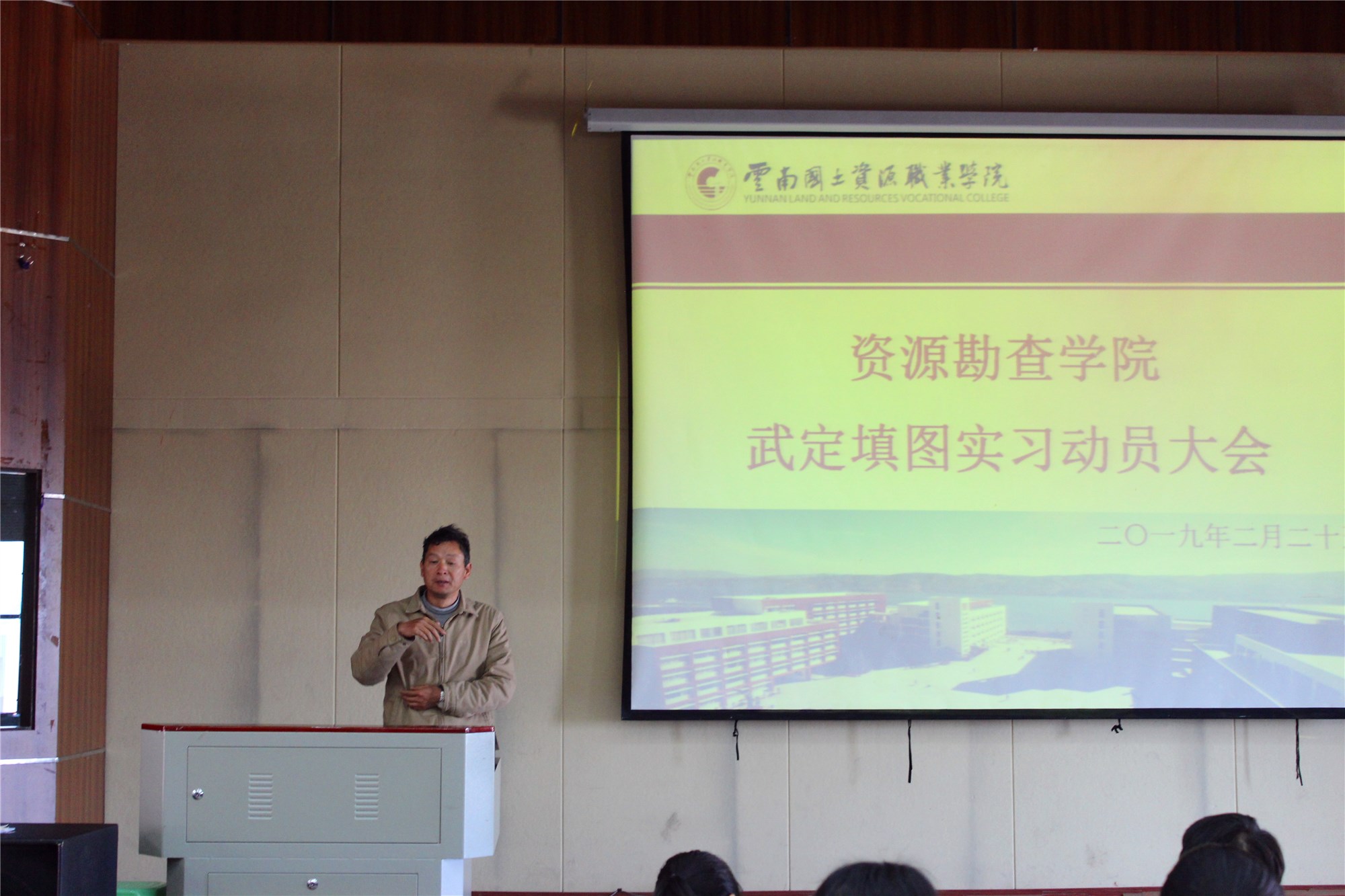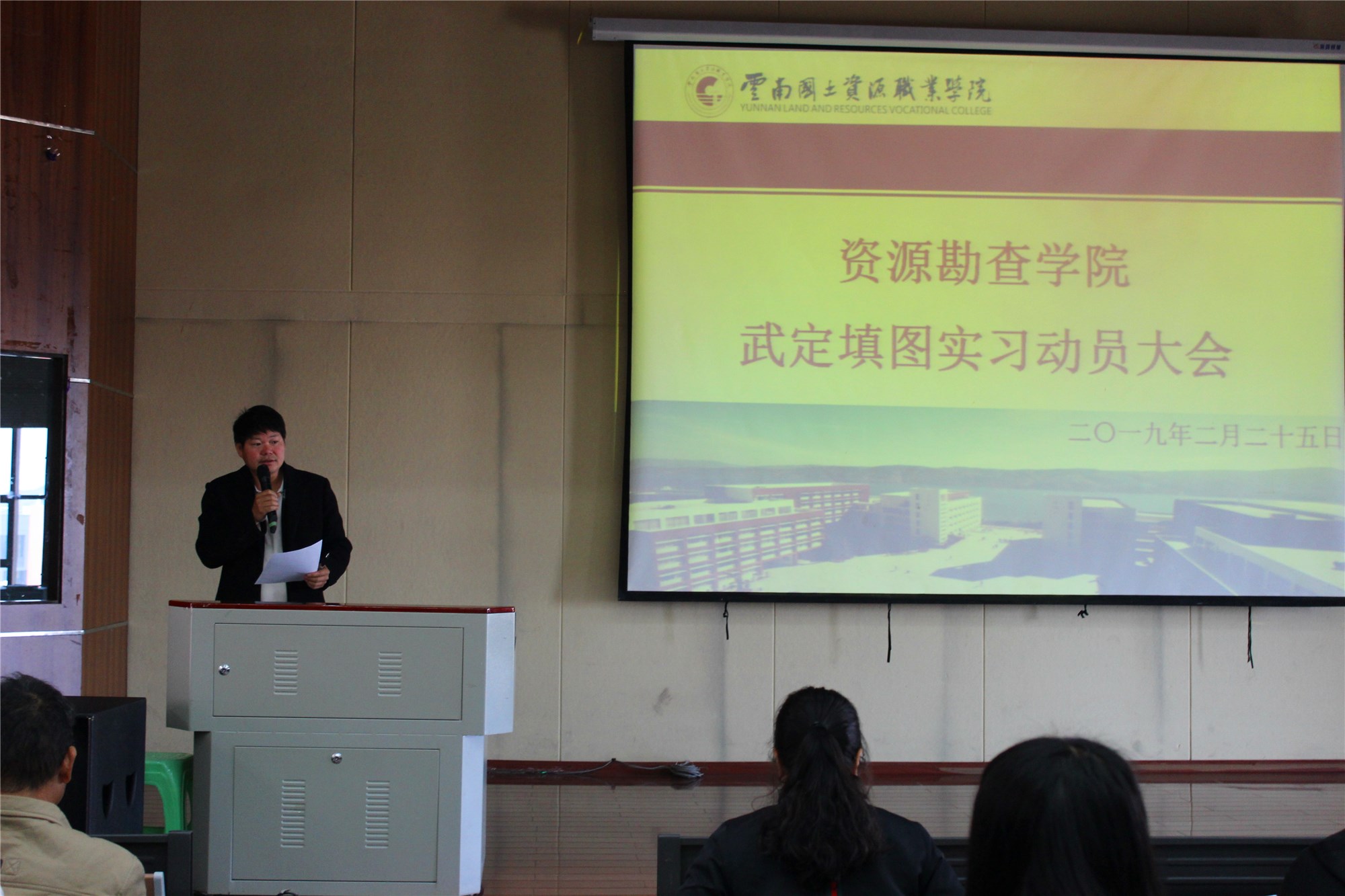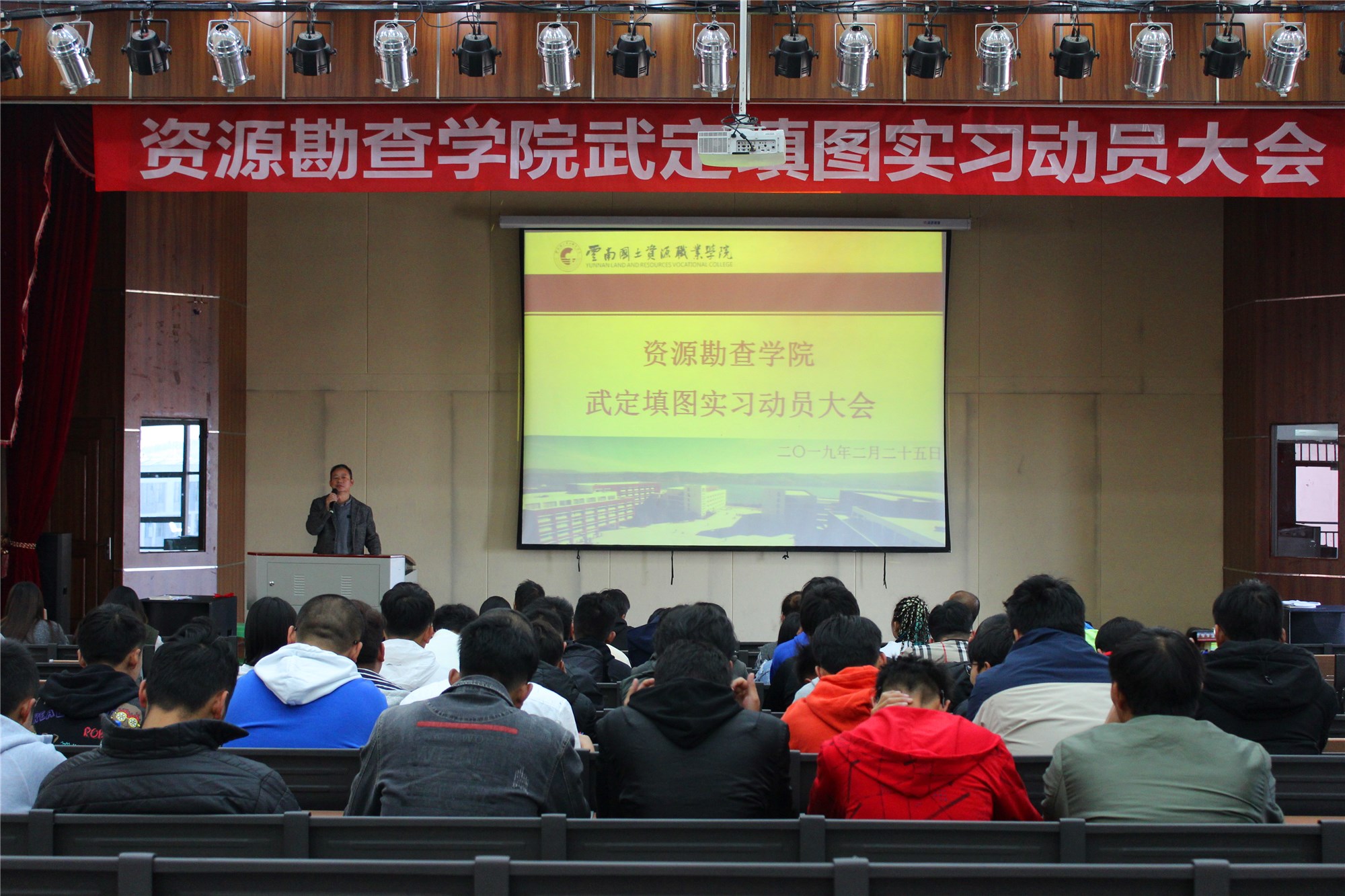 2月25日,公司2017级武定填图实习动员大会在光荣讲堂举行。公司经理左琼华、副经理李艳丽、实习指导主任徐永全、实习队长刘陈明、实习导师马绍春、实习导师杨德敏老师为公司17级矿勘班、地调1、2班开开展了此次动员大会。